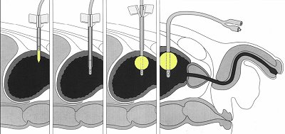 zwischen Schambein und Nabel in die Harnblase eingelegt